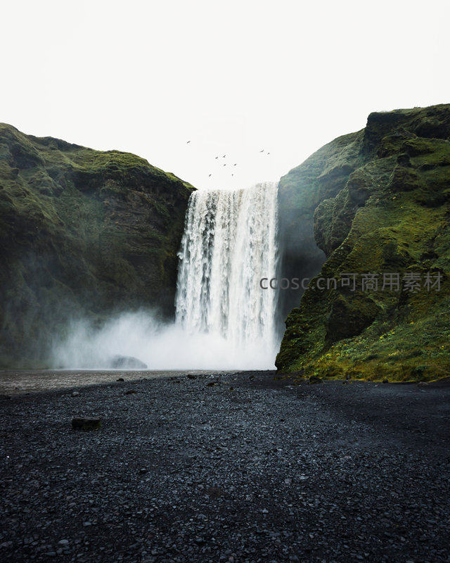 冰岛斯科加瀑布从高耸青苔覆盖的玄武岩崖壁倾泻而下,激起弥漫水雾,前方是粗粝黑沙砾滩,几只鸟掠过天际,展现北欧原始野性与地质奇观的磅礴力量。