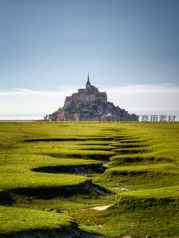 法国圣米歇尔山在退潮后显露于广袤翠绿盐沼之上,哥特式修道院尖塔直指晴空,层层起伏的草甸沟壑如大地指纹,阳光洒落,明暗交错,展现自然与人文奇迹的和谐共生。