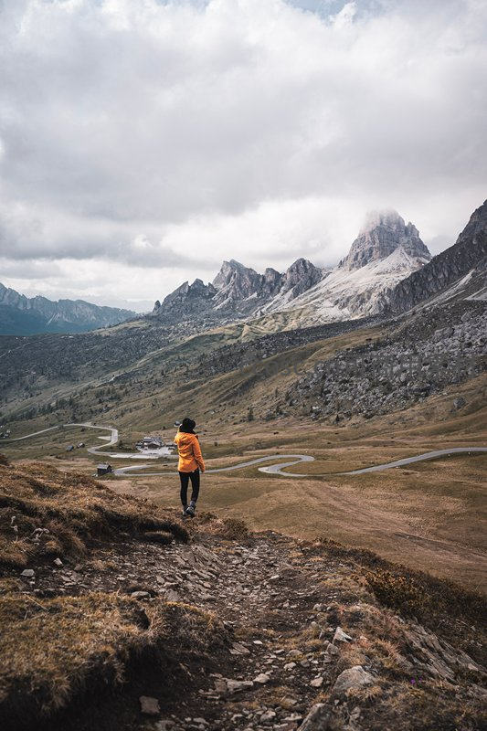 一位身着亮橙色冲锋衣的徒步者背对镜头立于山脊小径,前方是S形盘山公路蜿蜒穿行于褐黄草甸与灰岩山体之间,远处雪顶峰峦在云海中若隐若现,呈现壮阔而诗意的高山行旅场景。