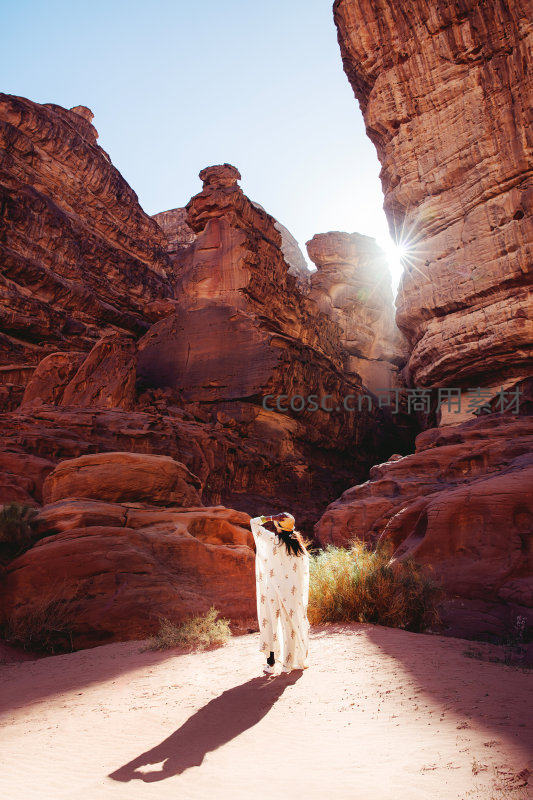 一位身着白色长裙的游客伫立于约旦瓦迪拉姆红砂岩峡谷深处,背对镜头仰望从高耸岩壁缝隙倾泻而下的耀眼阳光,形成星芒光效;沙地投下清晰长影,层叠岩层呈现赭红与暗褐交织的纹理,展现荒漠奇观与人类渺小的诗意对比。