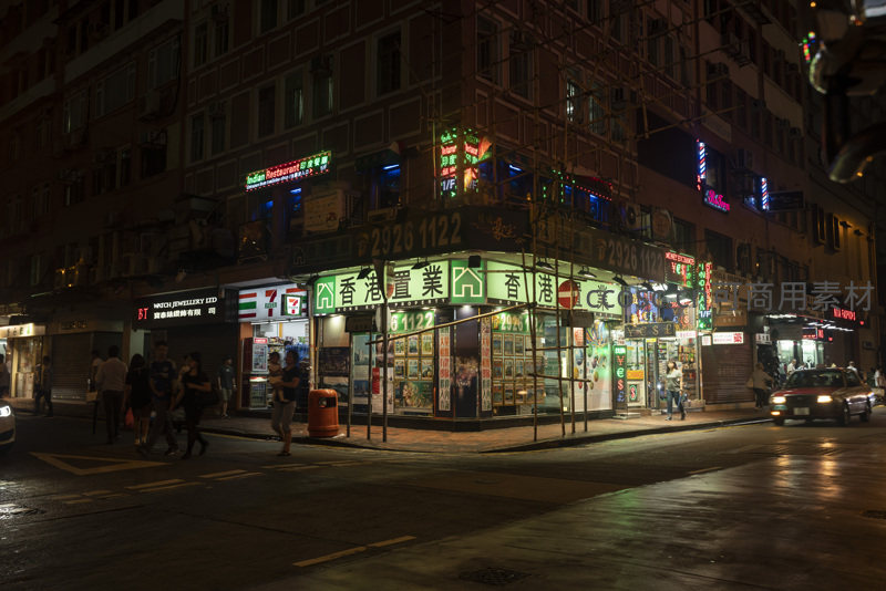 香港湾仔街角24小时药房与便利店霓虹交映夜景