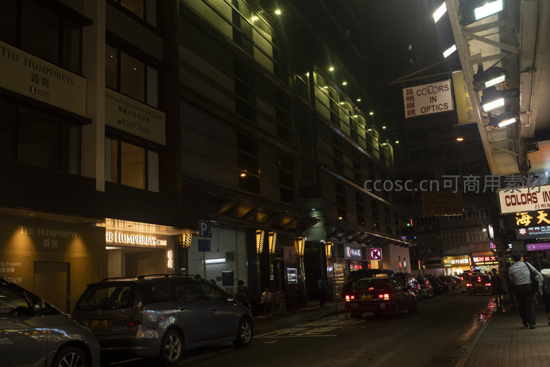 香港夜市街景,霓虹招牌闪烁,车流穿梭于狭窄街道间