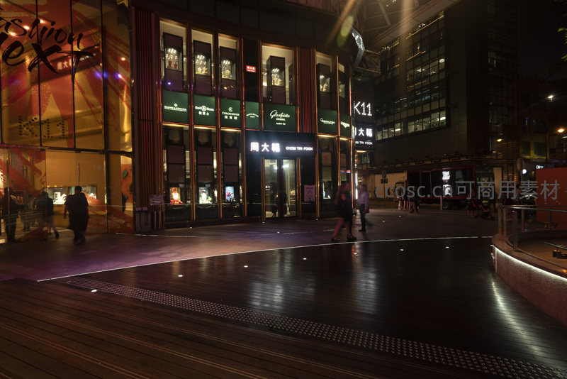 K11外广场铺设深色木质步道,嵌入式地灯营造光影节奏;Galerie、Raffles等高端品牌橱窗通透明亮,行人悠闲穿行,背景高楼玻璃幕墙反射霓虹,融合商业与艺术氛围。