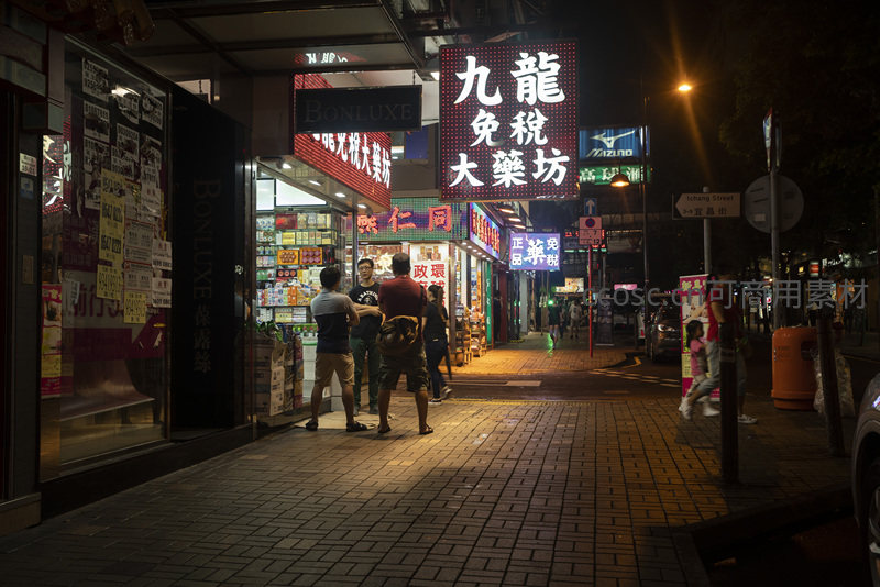 巨大‘九龙免税大药坊’LED招牌耀眼夺目,几位市民驻足交谈,孩童牵家长手走过砖砌人行道,背景中‘Bonluxe’等店招层叠,勾勒出典型港式夜间商圈图景。