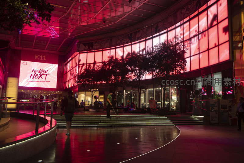 在K11炫目红光映衬下,清洁人员手持工具默默作业,与悠闲休憩的顾客形成动静对照;巨型屏幕播放‘Fashion Next’广告,展现繁华表象背后城市运转的真实温度与人文关怀。
