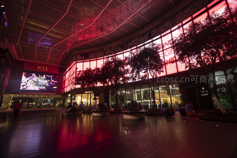 K11室内中庭航拍视角,红光映照下的开放式商业街区与休闲人群