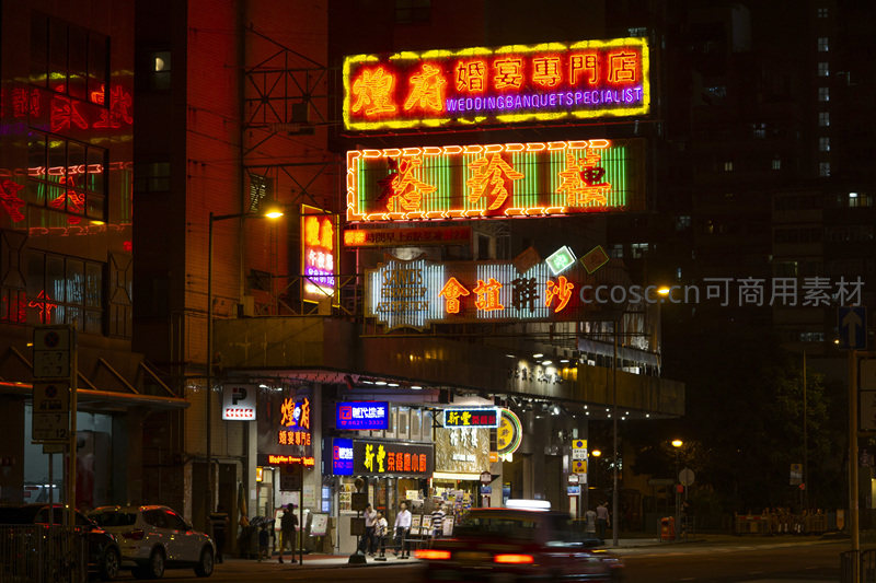 夜幕下,'婚礼宴席专门店'与'会馆群沙'等大型霓虹招牌以红绿黄三色交映,悬于老旧楼宇之间,体现香港独特的商业视觉文化与地域人文气息。
