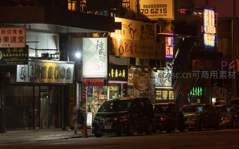 湾仔夜间街景老字号店铺与现代广告共存