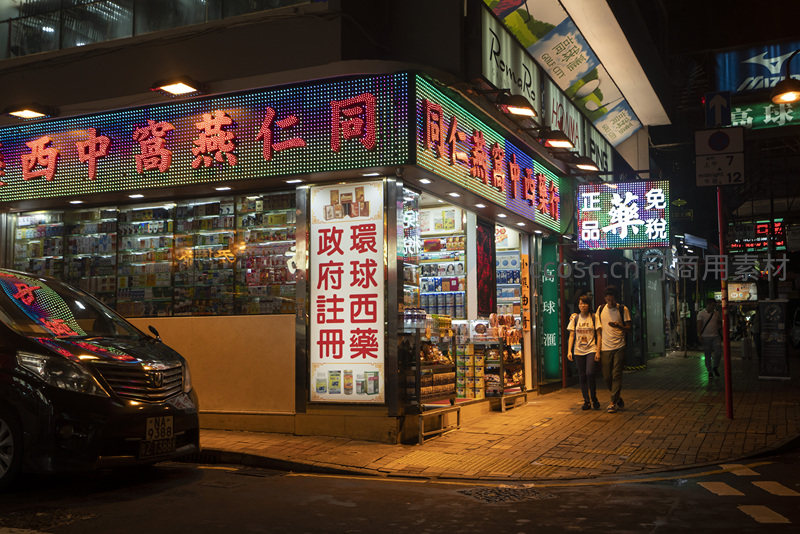 转角药房霓虹璀璨,行人漫步于香港夜间商业街角