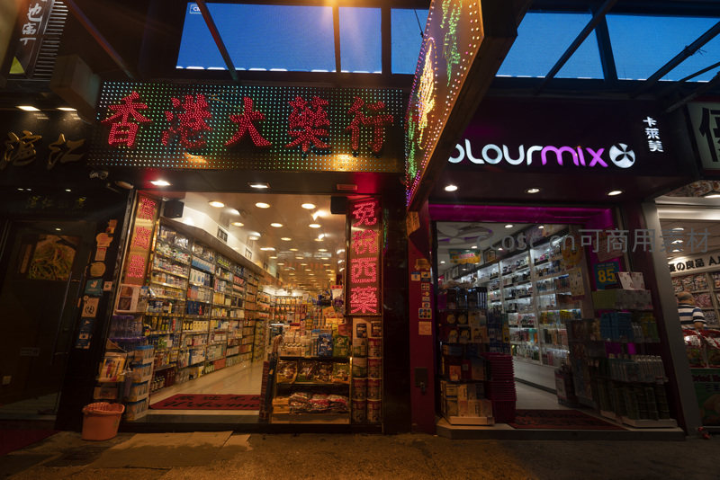 香港大药行门庭敞亮,霓虹招牌与店内货架构成经典街景