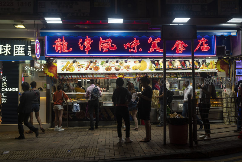 霓虹璀璨的香港夜市摊位:食客排队享地道风味