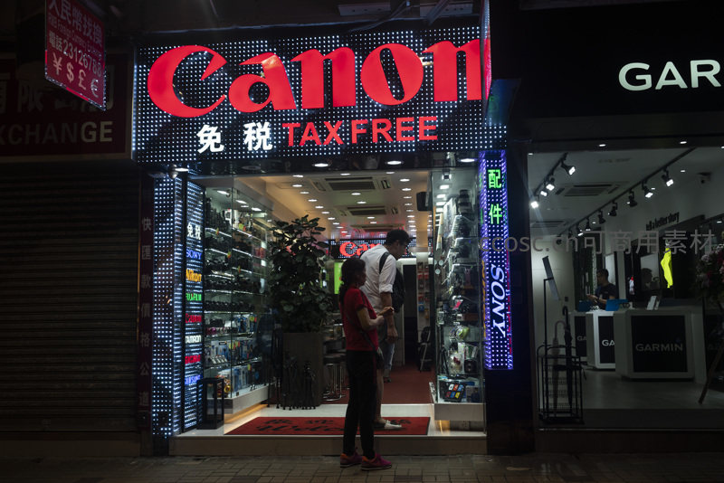 夜晚霓虹灯下的佳能免税店门口,顾客驻足浏览商品
