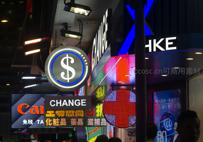 货币兑换店与药妆广告并置,美元符号霓虹灯与红十字标志醒目