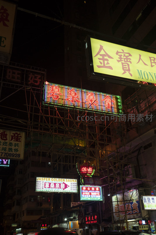scaffolding 架构中的‘碧泉桑拿’霓虹灯牌,多重招牌层叠展现都市垂直空间利用