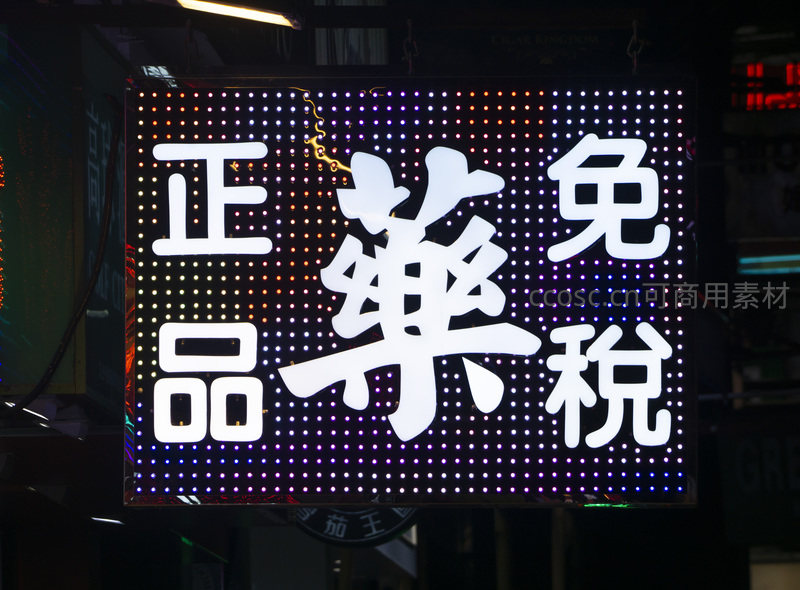 ‘正品免税药’LED点阵屏招牌,白字突出,背景紫蓝渐变光点闪烁如星空