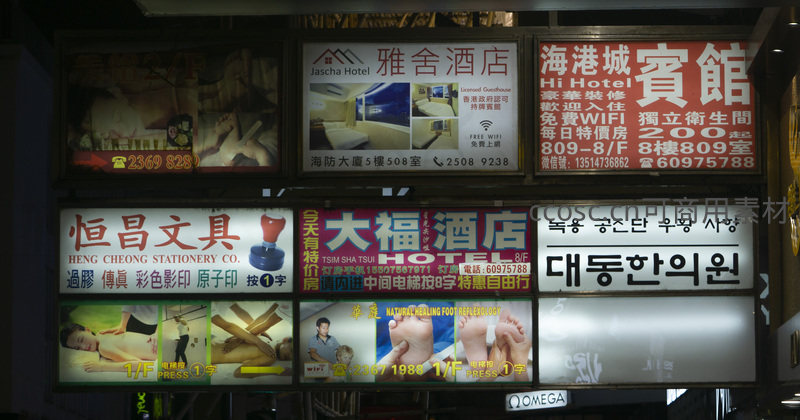 密集广告墙展现城市信息洪流:酒店、文具、足疗与韩语招牌共存