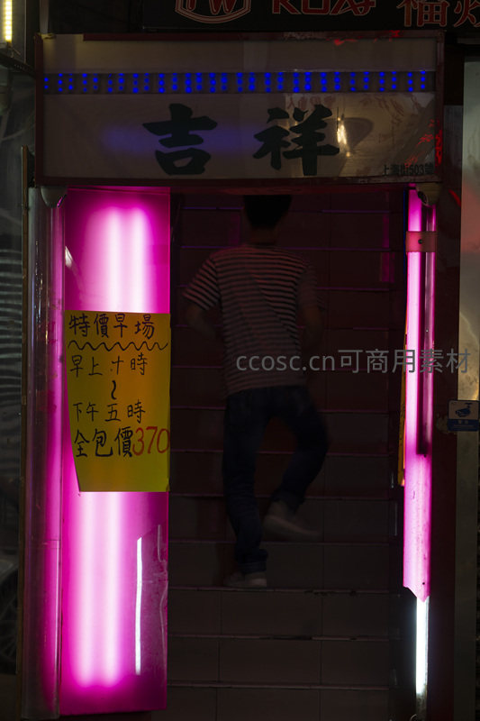 夜市霓虹灯下行人拾级而上,吉祥招牌与特价早场告示交相辉映
