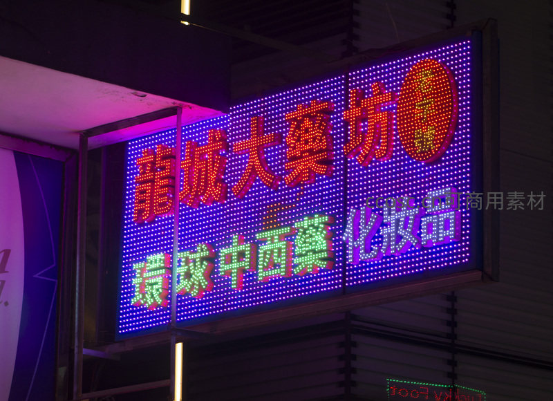 龍城大藥坊LED巨屏闪烁,中西药与化妆品广告交织霓虹夜色