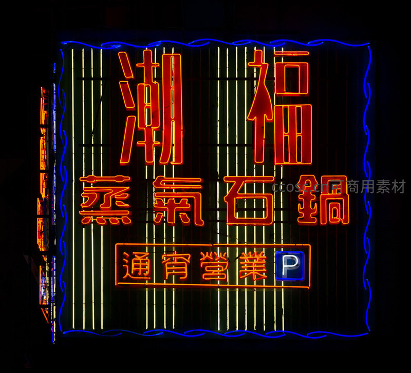 潮福蒸气石锅餐厅霓虹招牌,波浪边框与通宵营业标识