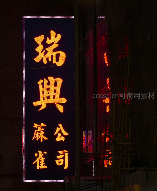 夜晚街头竖立的‘瑞興蔴公司’LED点阵式招牌,橙黄色汉字在深蓝色底板上熠熠生辉,边框点缀白色灯珠,右侧可见脚手架与建筑轮廓,展现典型港式街景商业氛围。