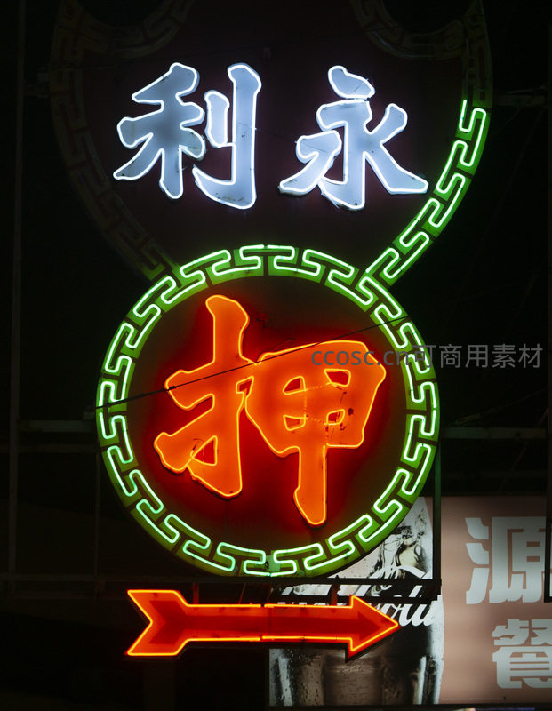 利永押铺霓虹招牌特写,白字‘利永’配绿边圆环与橙红‘押’字,箭头指引方向