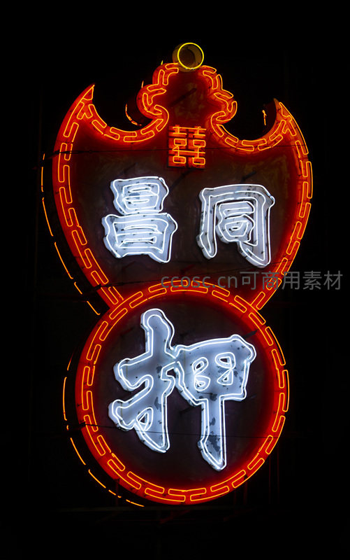 黑色背景衬托下,‘昌同押’招牌采用传统葫芦形制,上部‘昌同’为银白发光字,下部‘押’字居中于红底圆环,顶部饰有‘囍’字小灯,整体以红橙霓虹勾边,体现岭南民俗审美与旧式典当业的仪式感。