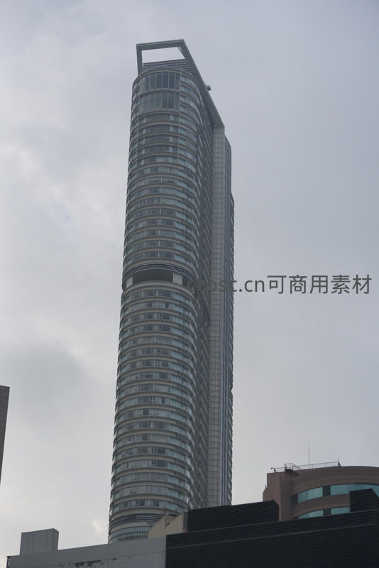 一座独特的螺旋形超高层建筑矗立于城市中,外立面由连续环状玻璃幕墙构成,顶部设有开放式框架结构;阴天背景下,建筑轮廓清晰,展现当代建筑设计的创新与力量感。