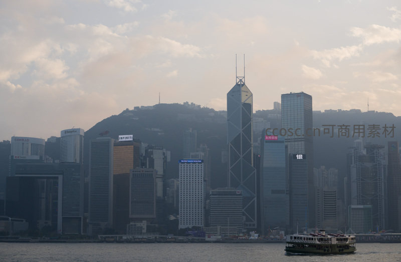 港岛金融区晨雾中的现代摩天楼群与渡轮