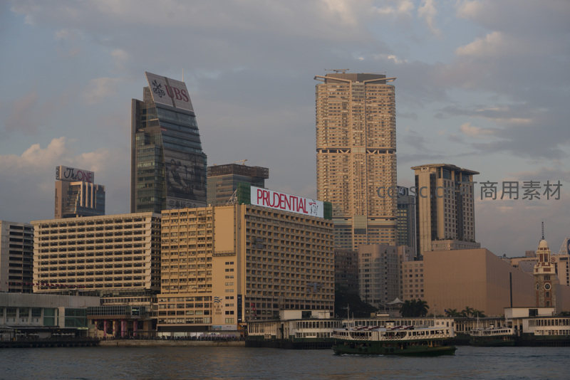 从维港对岸拍摄的中环核心商务区全景,WBS与Prudential等标志性建筑清晰可见,绿色渡轮穿行水面,低角度构图凸显建筑密度与都市活力,展现香港金融心脏的日常脉动。