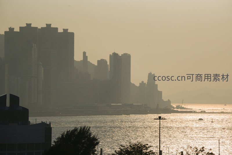 夕阳洒金维港水面,香港岛高层建筑群剪影如画