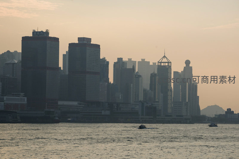 从九龙视角远眺港岛,高楼林立于金橙色暮霭中,海面波光闪烁,小型快艇划破水面留下尾迹,传统与现代交融,彰显国际金融中心的恢弘气韵与生活气息。