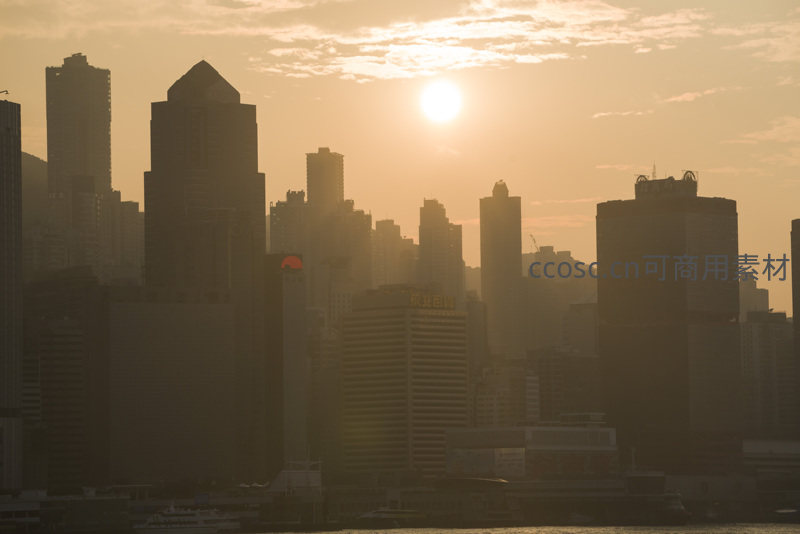 夕阳西下,金色余晖洒满维多利亚港上空,香港岛核心商务区高楼群轮廓分明,形成壮丽剪影;薄雾轻笼,光影层次丰富,展现国际都市的静谧与磅礴气韵。