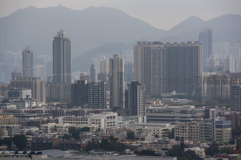 灰霾笼罩下的密集住宅区,高低楼宇交织,远山如黛