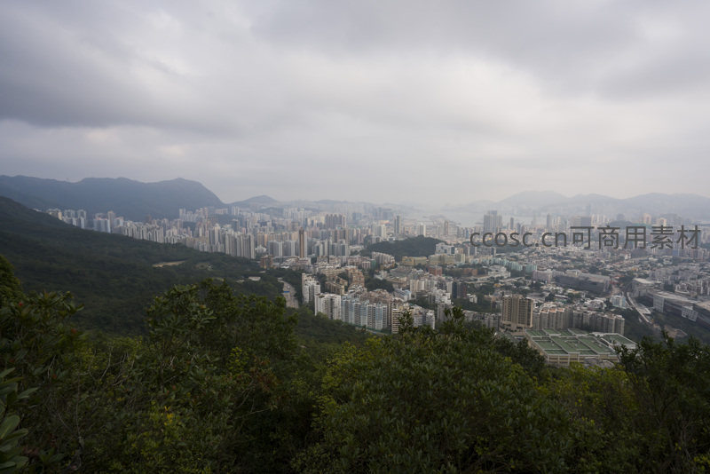 山脊俯瞰港岛密集住宅区,云层低垂下城市与绿意共生共存