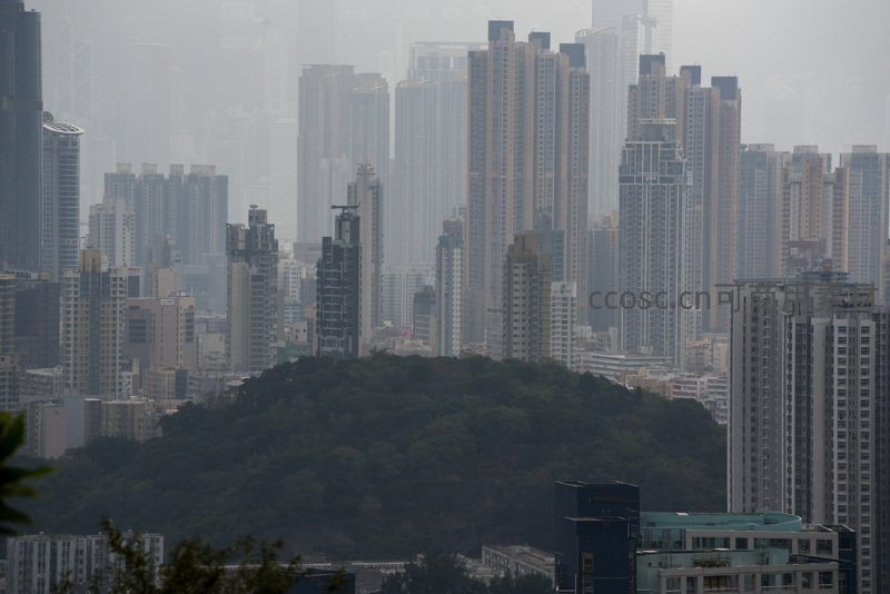 浓雾轻笼下,一座郁郁葱葱的小山丘成为画面视觉中心,四周被林立的超高层建筑包围,形成自然绿洲与钢筋森林强烈对比的标志性都市景观。