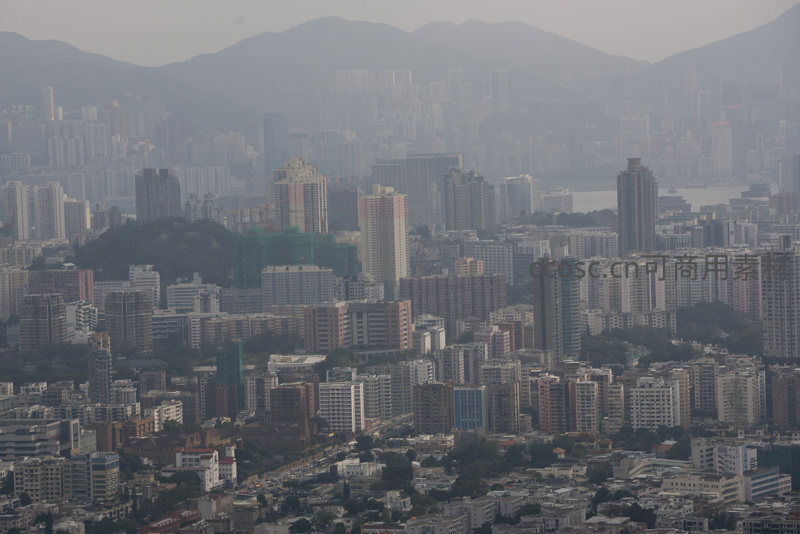 从高处拍摄的香港城市中段,大量住宅与商业楼宇紧密排列,山丘穿插其间形成独特立体城市结构;整体色调偏灰,反映典型亚热带高湿度与轻度雾霾共存的城市环境特征。
