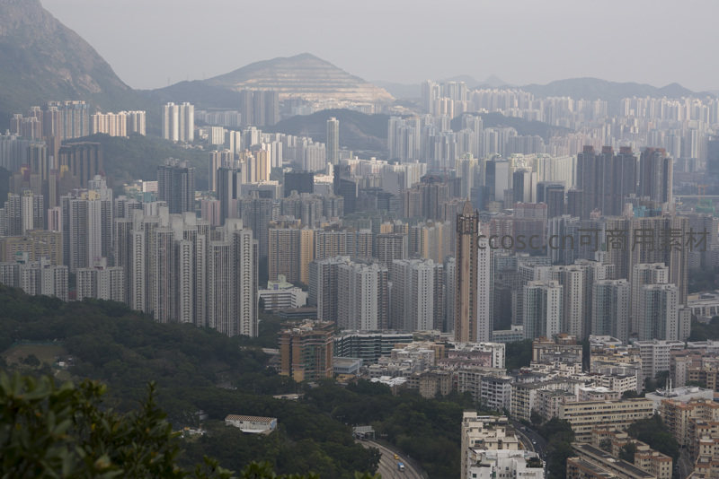 从高处俯瞰新界片区,成片白色与浅色高层住宅紧密排列于山麓地带,葱郁植被穿插其间形成绿色廊道,远山层叠朦胧,呈现山城融合、紧凑有序的典型东亚都市空间结构。