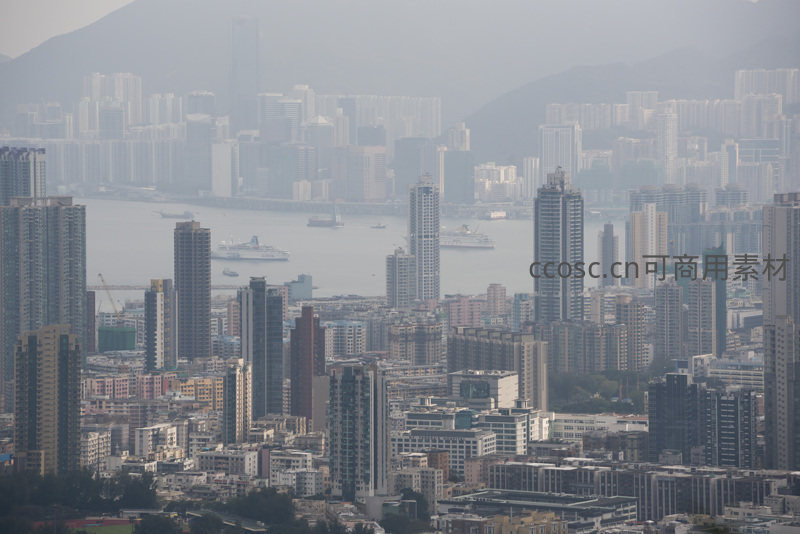 高空俯瞰香港密集高层建筑群与维多利亚港,远山隐于薄雾之中,数艘轮船穿梭水面,展现典型高密度滨海都市风貌与朦胧诗意氛围。