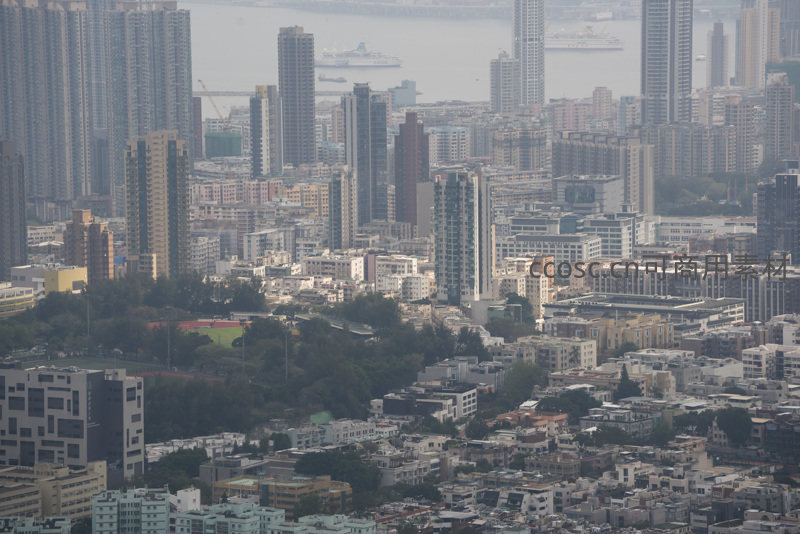 香港市区密集住宅区与绿茵公园交错的中景航拍