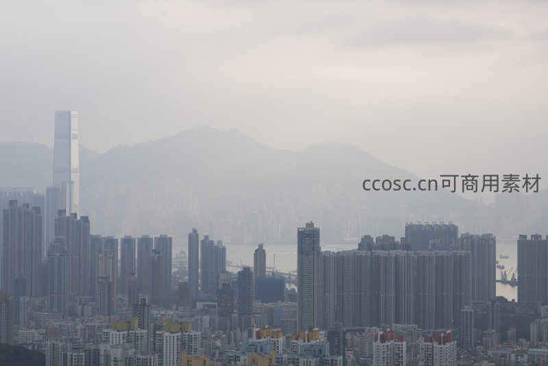 高角度俯瞰香港密集高楼群与维多利亚港,远山隐于薄雾之中,国际金融中心等标志性建筑若隐若现,展现东方之珠在阴云天气下的静谧与壮阔。