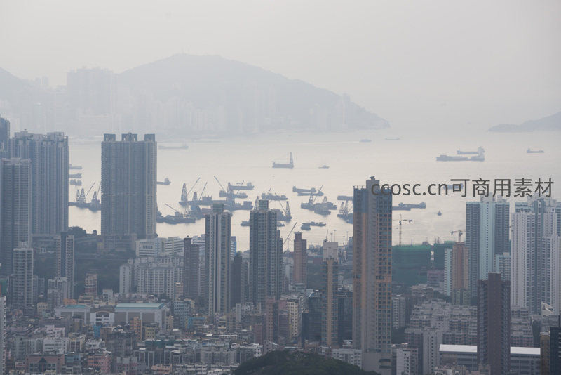 维多利亚港水面散布货轮与施工平台,两岸密集住宅与商业楼宇在灰白雾气中轮廓模糊,呈现繁忙港口与超高层城市共生的独特视觉层次与工业诗意。