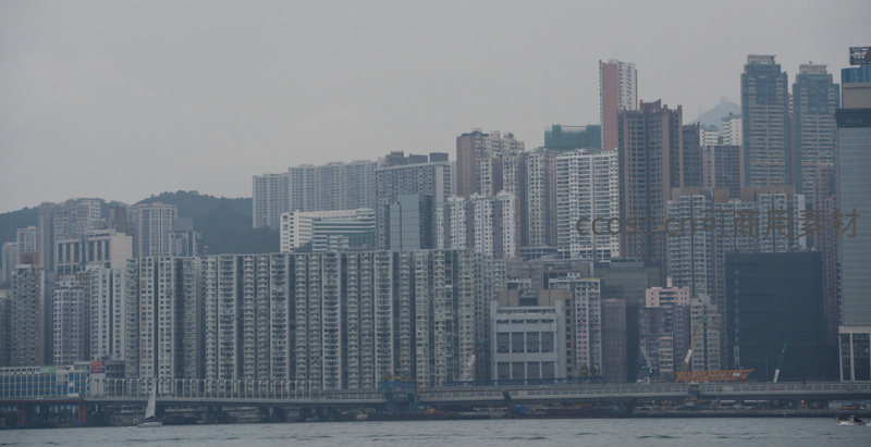 香港密集住宅区临海而建,灰蒙天空下楼群层叠壮观