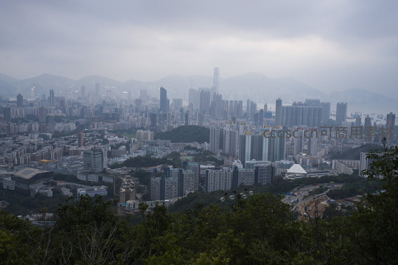 山顶俯瞰雾霭香港全景,楼宇森林与青山相映