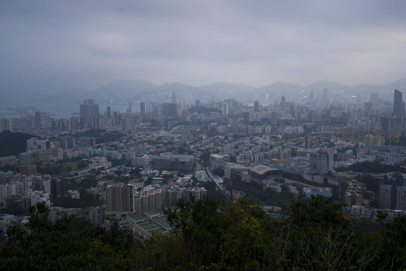清晨薄雾弥漫,镜头捕捉香港全域:密集楼群沿山势起伏分布,维港水道蜿蜒其间,远山轮廓柔和,前景树冠剪影增强景深,整体色调冷静克制,凸显国际都市在自然约束下的紧凑发展形态。