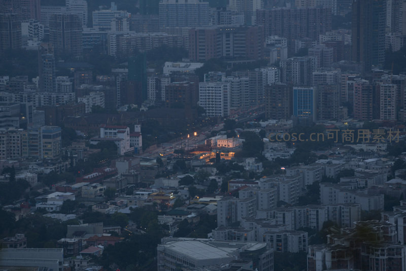 航拍视角捕捉九龙城区黄昏景象:密集旧式住宅楼群依山而建,道路蜿蜒穿行其间,局部亮起暖黄灯光,绿植点缀屋宇间隙,展现真实市井生活的温度与层次。