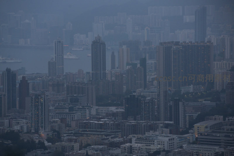 从山巅俯瞰,浓雾弥漫的维多利亚港将两岸建筑群柔化为灰蓝调剪影,数艘货轮与渡轮点缀水面;近处住宅楼群密集,远处金融区高楼隐约可见灯光初启,呈现香港独特的山海城交融地貌与朦胧诗意。