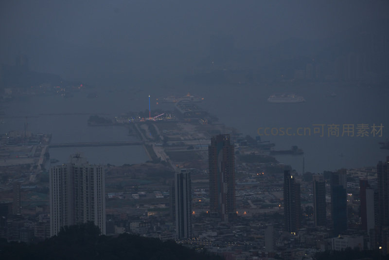 俯瞰启德邮轮码头夜景,灯塔与货轮点缀迷蒙海面