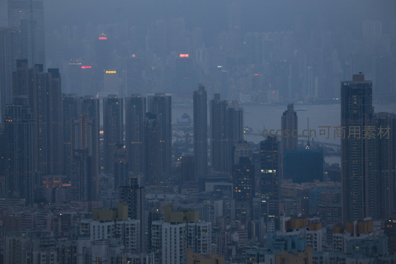 暮色中的香港维港天际线,高楼林立,灯火初上,雾气弥漫