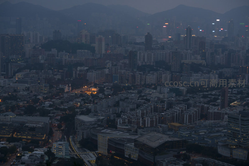 香港低密度城区夜幕初降,街灯蜿蜒,山体环抱,楼宇错落有致