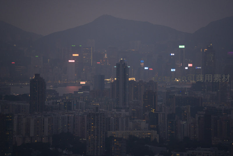 山影叠嶂间的城市灯火,港岛夜幕低垂,楼宇如棋盘般铺展于海湾之畔